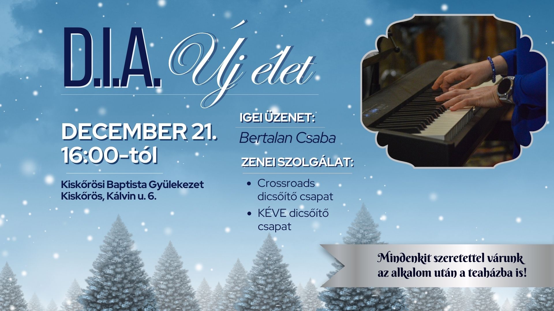 Régen várt D.I.A. (dicsőítő és imaalkalom) kerül megrendezésre gyülekezetünkben December 21-én vasárnap délután 16:00-tól. Igei üzenettel Bertalan Csaba (Pécsi Szeretetvár Gyülekezet Ifjúsági lelkipásztora) készül. A zenei szolgálatot pedig a Crossroads dicsőítő csapat és a KÉVE dicsőítő csapat végzi. Az alkalom után mindenkit szeretettel várnak a szervezők a Teaházba, ami a közösségi épületben lesz.